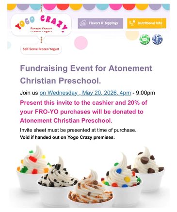 Make sure to use code "preschool" on mobile orders, show this flyer or mention Atonement for the preschool to earn 15% proceeds of sales made anytime Tues. April 14.
